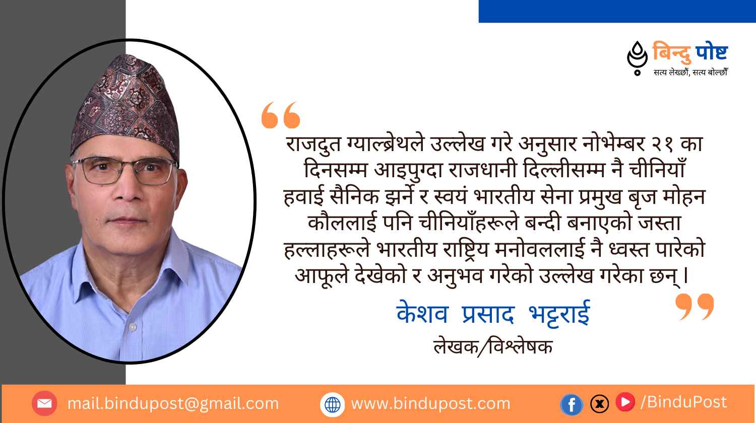 २०८१ असोज १७ गते, बिहिबारजताततै जटील भूराजनीतिक द्वन्द्वको स्थिति विकास भइरहेको र आफ्नो क्षेत्रमा त्यस्तो द्वन्द्वको भूमरी विकास भइरहेको अवस्थामा उत्तेजनात्मक, सतही र सस्तो सडक कूटनीतिका नारा र अभ्यास कुनै मुलुकले नगरिदिए मात्रै पनि विश्वमा शान्तिको एउटा कुनो निर्माण हुन्छ I