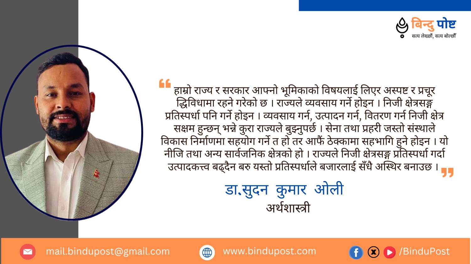 २०८२ असार १५ आईतवारराज्यले व्यवसाय गर्ने होइन । निजी क्षेत्रसङ्ग प्रतिस्पर्धा पनि गर्ने होइन । व्यवसाय गर्न, उत्पादन गर्न, वितरण गर्न निजी क्षेत्र सक्षम हुन्छन् भन्ने कुरा राज्यले बुझ्नुपर्छ । सेना तथा प्रहरी जस्तो संस्थाले विकास निर्माणमा सहयोग गर्ने त हो तर आफैं ठेक्कामा सहभागि हुने होइन । यो नीजि तथा अन्य सार्वजनिक क्षेत्रको हो ।