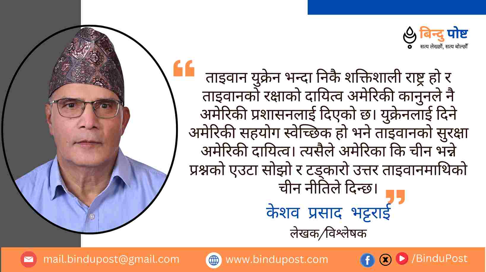 युक्रेनलाई दिने अमेरिकी सहयोग स्वेच्छिक हो भने ताइवानको सुरक्षा अमेरिकी दायित्व। त्यसैले अमेरिका कि चीन भन्ने प्रश्नको एउटा सोझो र टड्कारो उत्तर ताइवानमाथिको चीन नीतिले दिन्छ।