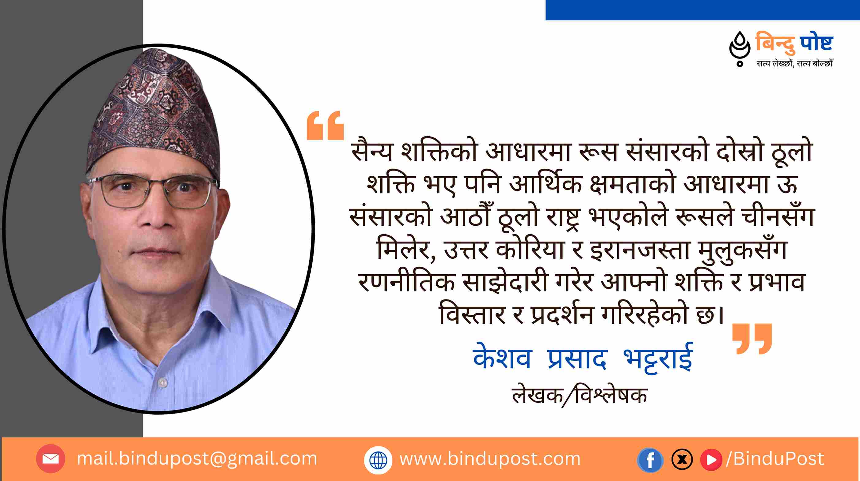 २०८१ असोज १७ गते, बिहिबारजताततै जटील भूराजनीतिक द्वन्द्वको स्थिति विकास भइरहेको र आफ्नो क्षेत्रमा त्यस्तो द्वन्द्वको भूमरी विकास भइरहेको अवस्थामा उत्तेजनात्मक, सतही र सस्तो सडक कूटनीतिका नारा र अभ्यास कुनै मुलुकले नगरिदिए मात्रै पनि विश्वमा शान्तिको एउटा कुनो निर्माण हुन्छ I