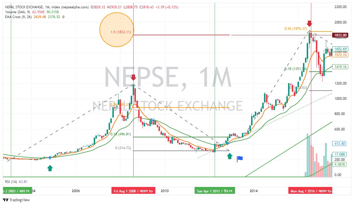 Nepse Index चार्ट अध्ययन गर्दा बजारले प्रत्येक प्रमुख बुल रन (बजार उकालो लाग्ने चक्र) मा Fibonacci 1.5 स्तर नजिकै पुगेर ठूलो करेक्शन भोगेको देखिन्छ। Fibonacci लक्ष्य, समर्थन र प्रतिरोध बिन्दुहरू (Arrows), र विगतका वर्षहरूमा देखिएको बजार प्रवृत्तिको विश्लेषणले आगामी बजार चालबारे संकेत मान्न सकिन्छ। यसैको आधारमा यो आलेख तयार पारीएको छ।