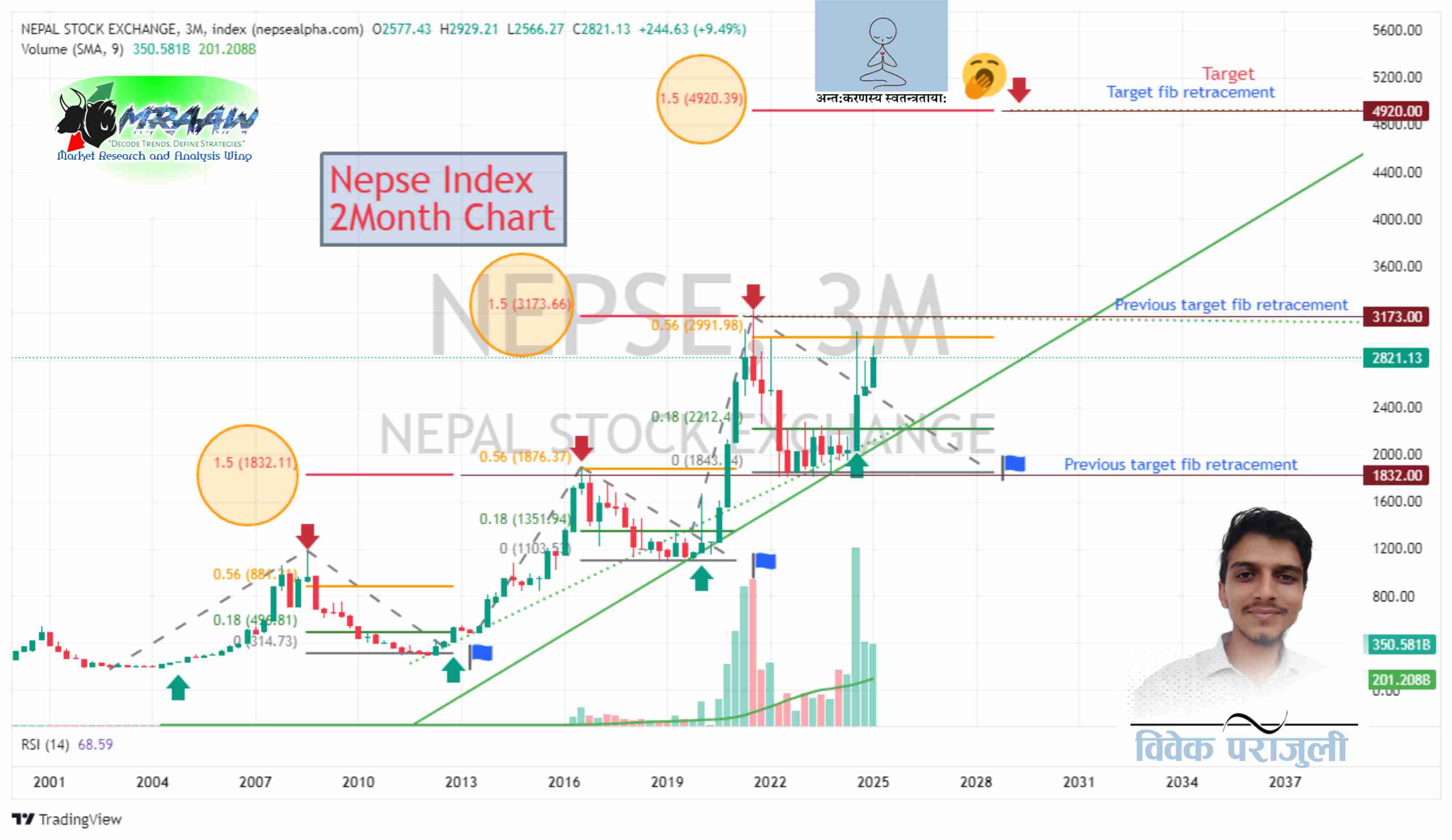 Nepse Index चार्टमा देखिएका Fibonacci 1.5 स्तर, Arrow, र वार्षिक प्रवृत्तिहरू अध्ययन गर्दा बजारको चलायमानता बुझ्न मद्दत मिल्छ।